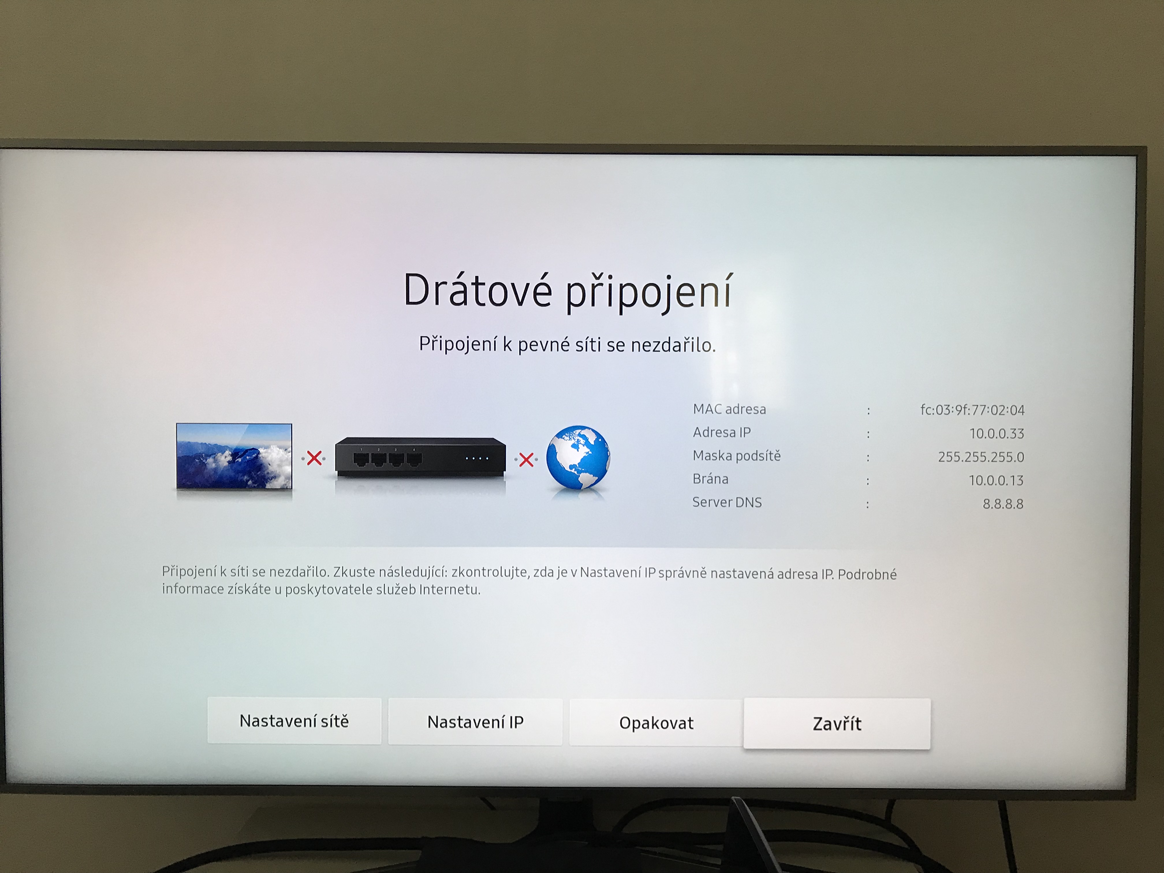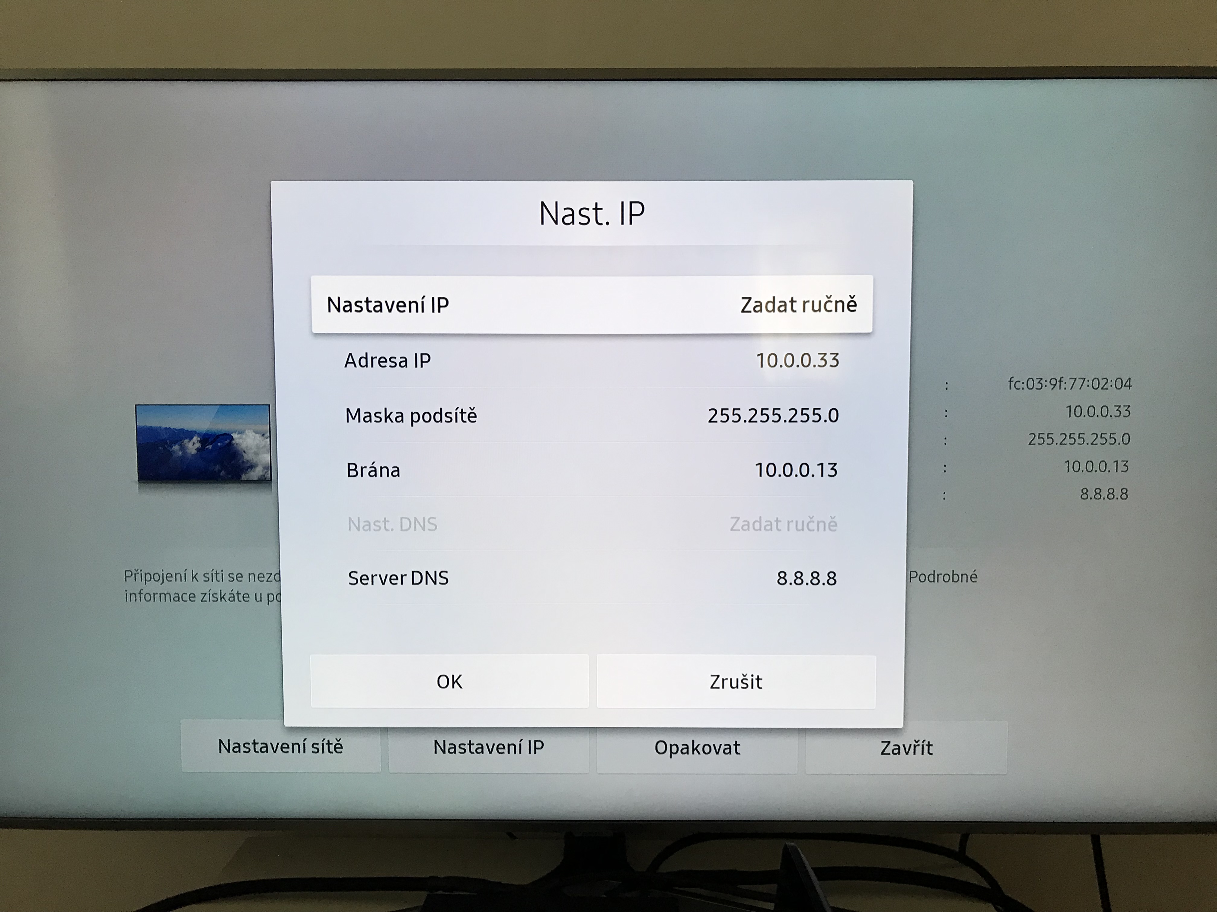 Televizor mě informuje abych povolil DHCP, nebo zadal IP adresu, Masku, Bránu a DNS ručně = buď jsem vždy zadával špatně, nebo prostě nevím.