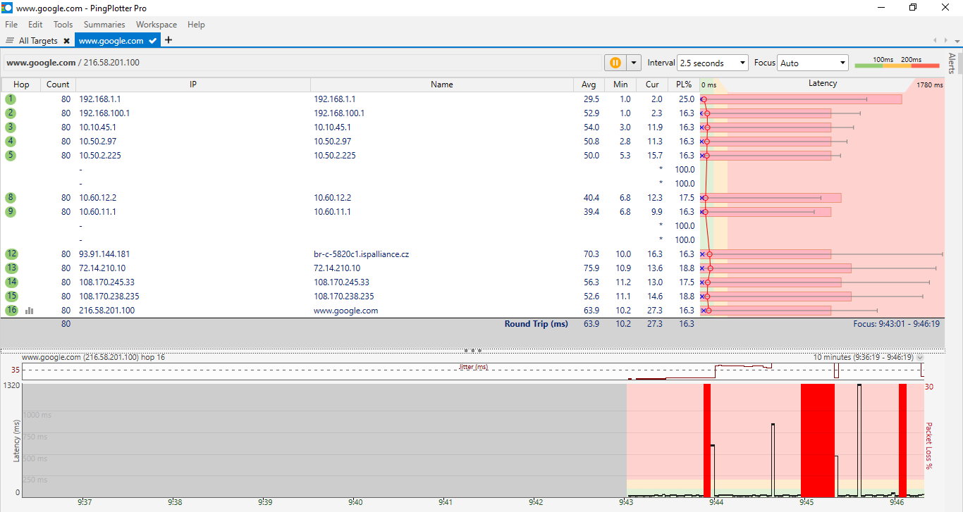 Přikládám screenshot z Pingplottru a ukázku pingů na google a na IP adresu routeru: