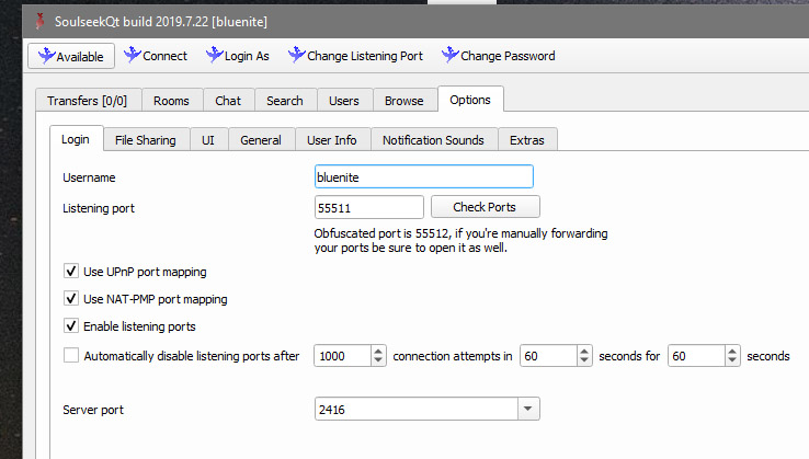 Jinak v nastavení máš dva porty - Listening port a Server port. A v port forwarding routeru tyto nasměruješ na IP adresu tvého PC.
