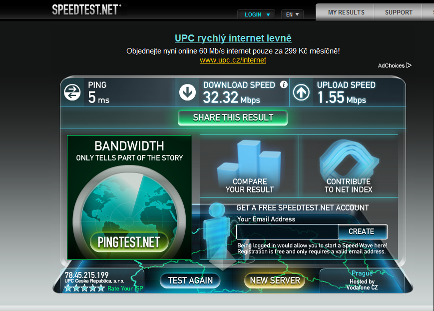 Zdravím mám problém s internetem. Jede v pořádku - ale rychlost stahování a nahrávání na server je oproti naměřeným rychlostem na např. http://www.speedtest.net velmi nízká. Ve screenu vidíte jakou rychlost bych měl mít a jakou mi to naměřilo to je správně. Ovšem když si chci někde něco stáhnou např. stahuj.cz nebo slunecnice.cz nebo hellspy.cz http://www.cnet.com nebo na torrentu tak nikdy nestahuji rychleji než 3,8 MB/s. A nikdy neuploaduji rychleji než 200 KB/s. Je to normální? Asi ne co protože když mám tak docela rychlý net tak proč nestahuji rychleji? Všude max. 3,8 MB/s nikdy ani o píď rychleji.