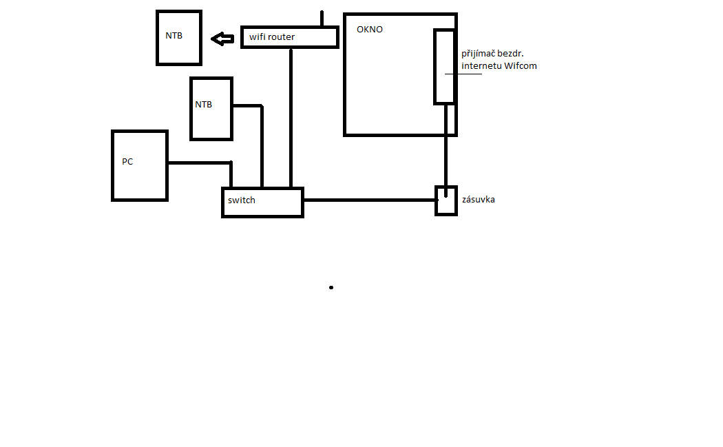 U switche výrobce nevím, jeden stolní počítač, dva ntb Asus Aspire, z toho jeden na kabel a jeden na wifi. Schémátko je tak je to zapojeno teď. Zkoušeli jsme i úplně vyhodit ten switch a zapojit všechno do routeru. Poskytovatel sítě nám řekl, že to má být zapojeno v routeru v LANU (ne ve WANu) a máme to zkoušet.