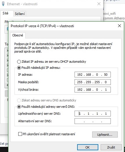 A dvojklikem na ip v4 se dostanes na manualni nastaveni tak tam potom zadej hodnoty ktere jsem psal drive