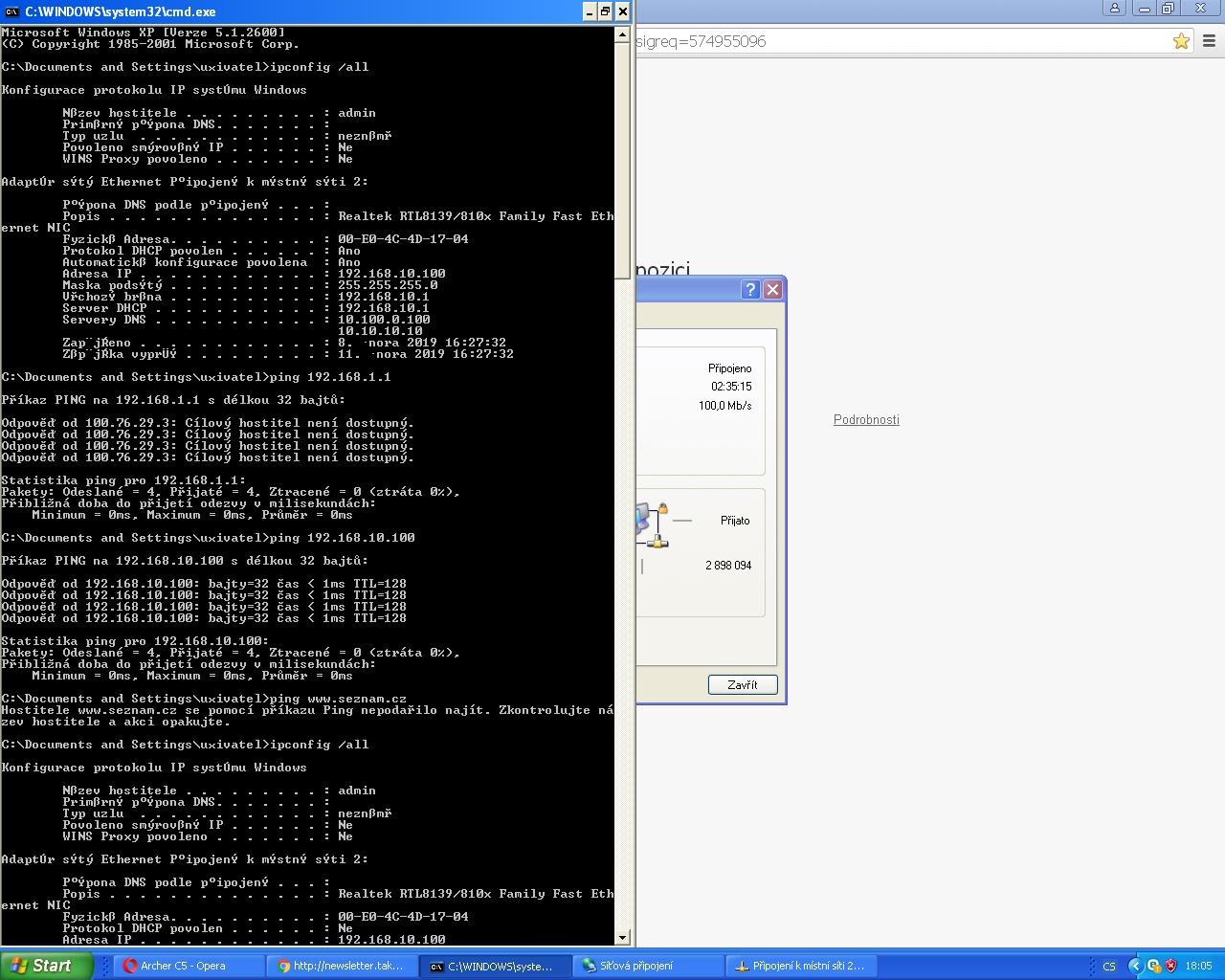 - zkontroluj pomocí ipconfig přidělenou IP adresu (měla by být 192.168.10.1xx)