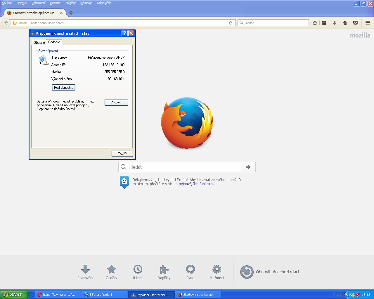 - zkontroluj, zda je přidělena IP adresa (ipconfig) a zjisti číslo brány (bude asi 192.168.0.1, nebo 1.1.