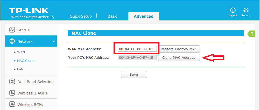 - stiskni tlačítko Clone MAC Address