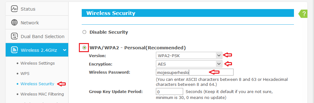A pak nastav zabezpečení wifi (Security)