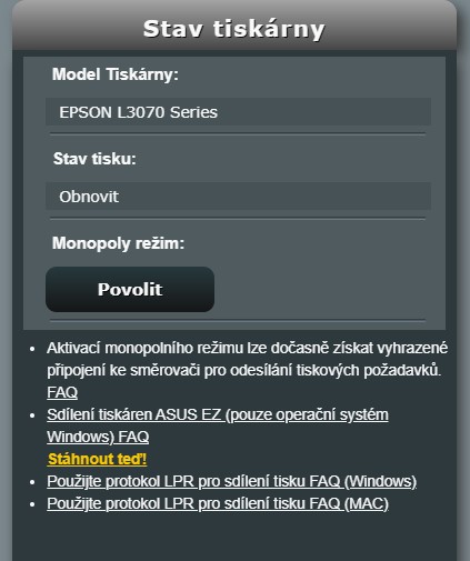 xx30: Pokud klikneš na odkaz EZ printer, nasměruje tě to na stránky podpory asusu. Tam vyplníš svůj router, klikneš na Podpora a Ovladače, vybereš systém a rozklikneš +Rozbalit vše. Najdeš MFP ovladač .