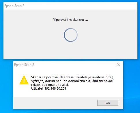 Tiskárnu jsem odpojil os stolního PC a zapojil jen do USB na routeru. Na stolním PC i na NTB jsem ji našel jako síťovou tiskárnu. Tisk funguje ze všech zařízení v pohodě, a tiskárna dokonce zůstala i připojená k wifi ( nevím jestli to není ten problém s tím scanerem ). To scanování jsem zkoušel na stolním PC právě přes Epson scan 2 a tam se nějak bijí IP adresy stolního PC, který je do k routeru připojený kabelem, to je ta 209 na konci a Epson tiskárny, to je 244 na konci. Když jsem spustil Epson scan2, zobrazila se hláška z prvního obrázku, že je scaner používaný uživatelem ( stolní PC IP .209 ) a po odklepnutí hlášky se otevře druhé okno s IP 244 což je IP adresa tiskárny ( je zobrazená i v připojených zařízeních na routeru ).