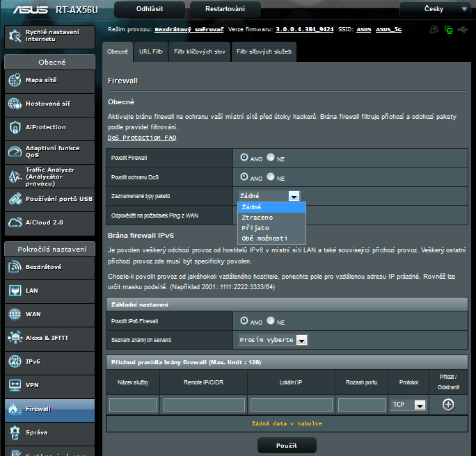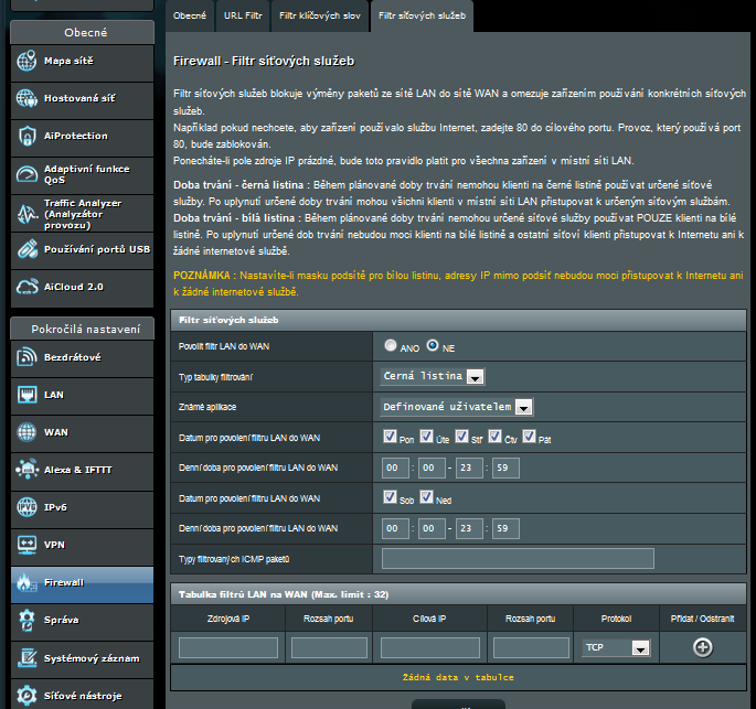 Firewall doporučuji povolit. Zároveň se router umí bránít DoS útokům, můžete zde zakázat ping na WAN port (tedy ping z internetu) a zapnout logování firewalluURL filtr - funguje jako blacklist, nebo whitelist. Pokud zadáte URL do blacklistu, stránky se nezobrazí. Pokud do whitelistu, zobrazí se pouze povolené stránky.Keywords blokuje stránky na základě toho, zda obsahují klíčová slova zde zadaná. Nefunguje pro https.Síťové služby zakazuje/povoluje pakety pouze pro určité služby.