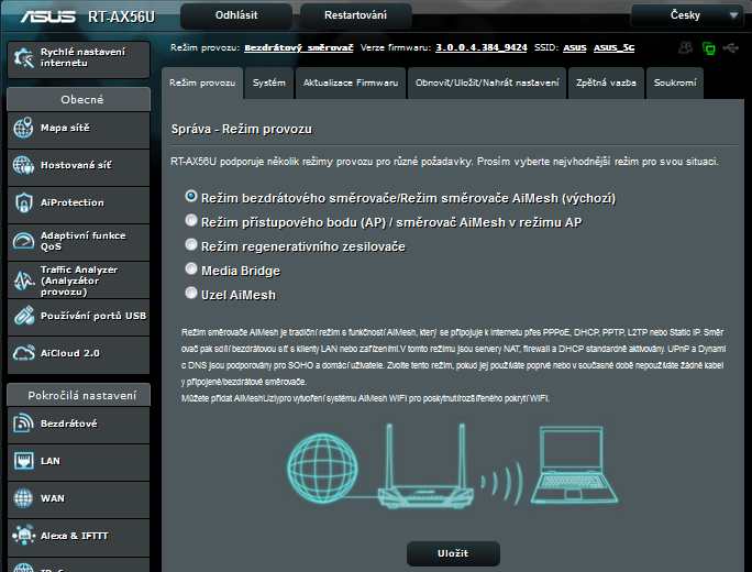 Režim provozu pouhým kliknutím si zvolíte, v jakém režimu router poběží.