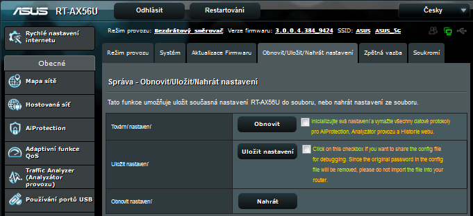 Uložit/Nahrát nastavení - pokud si nastavení routeru uložíte, pak v případě továrního resetu stačí nastavení jednoduše nahrát zpět.Zpětná vazba - můžete posílat případné problémy Asusu.