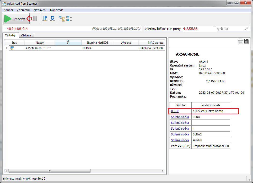 Nabídne výběr mezi instalací a spuštěním - vyber spuštění. Dále vyplň IP adresu, porty (na obrázku červeně) a stiskni skenovat. Po chvíli naskočí na pravé straně výsledek. Pokud se tam objeví http (případně https) - v mém případě označeno červeným rámečkem - klikni na odkaz. V prohlížeči by se měla zobrazit přihlašovací stránka.