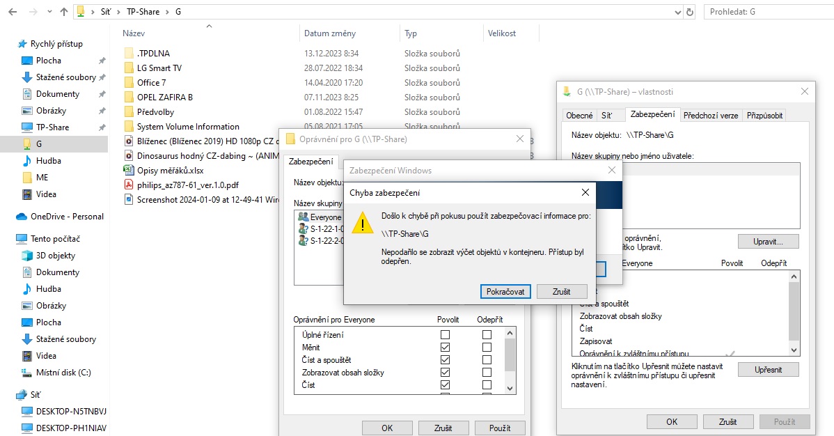 Pokud z PC s W7 chci změnit v záložce Zabezpečení práva u Everyone pro přístup do sdíleného adresáře na flešce, systém mi to nedovolí z důvodu nedostatečných práv (obraťte se na správce). To stejné nastane, pokud chci změnit zabezpečení ve sdílené složce z PC s W10. Přitom pro dané PC s W7 jsem jako Administrátor a ve webovém prohlížeči v nastavení routeru AX50 na záložce pro sdílení disku je povolen přístup pro admina i pro hosty. Je nutný zásah do nastavení práv v W10 a kde tato nastavení hledat? Oba počítače jsou připojeny na LAN porty Archeru C50, odtud přes switch 1 do LAN portu AX50 (viz předchozí obrázek, pouze switch 2 ještě není osazen). Ještě mne napadlo, že mám doma jeden NTB s W10, kde můžu také odzkoušet přístup na flash disk. Zítra vyzkouším a dám vědět. Ale kdyby někoho napadlo, kde hledat chybu...
