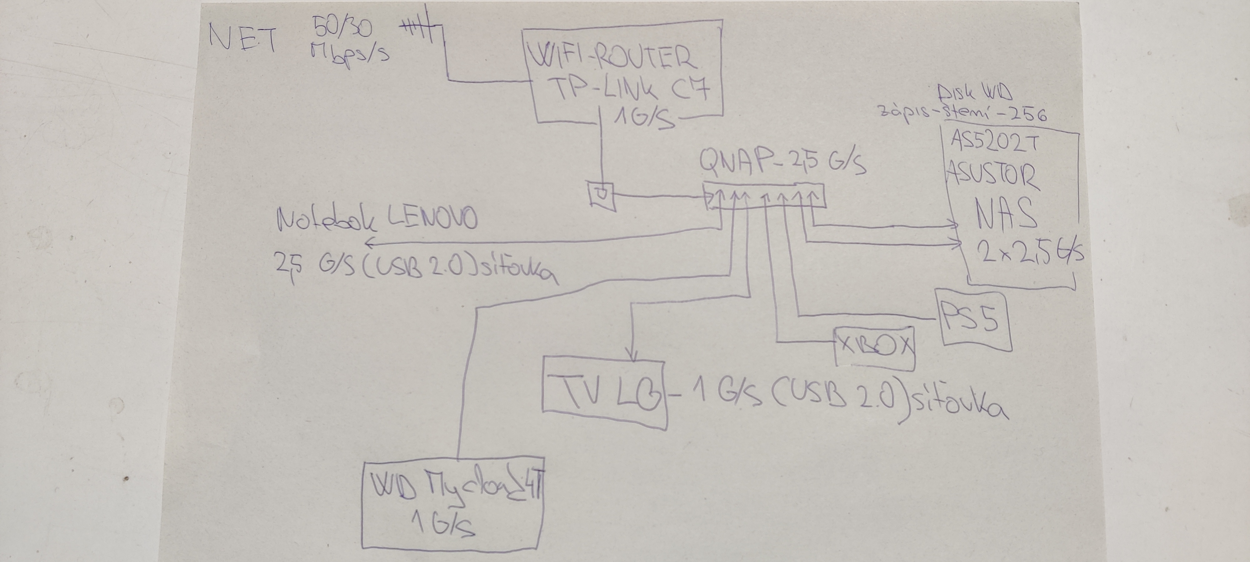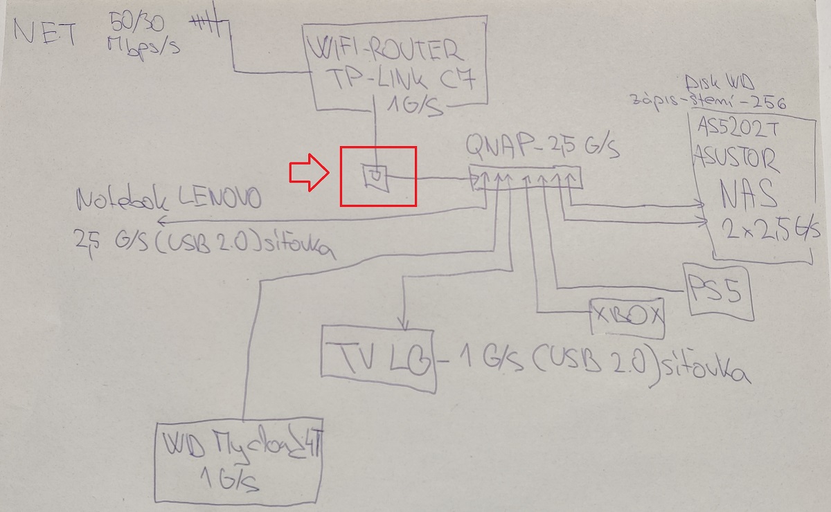 Teď řešíme problém pomalý přenos dat NAS<->ntb. Pak dořešíme problém s výpadkem internetu a nefunkční sítí při výpadku.