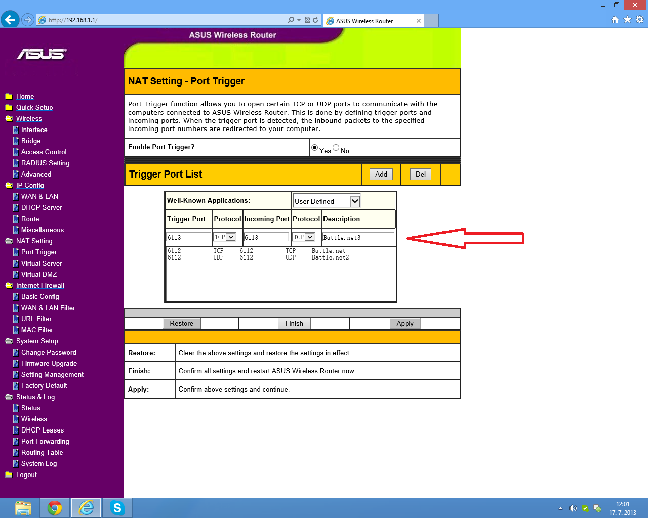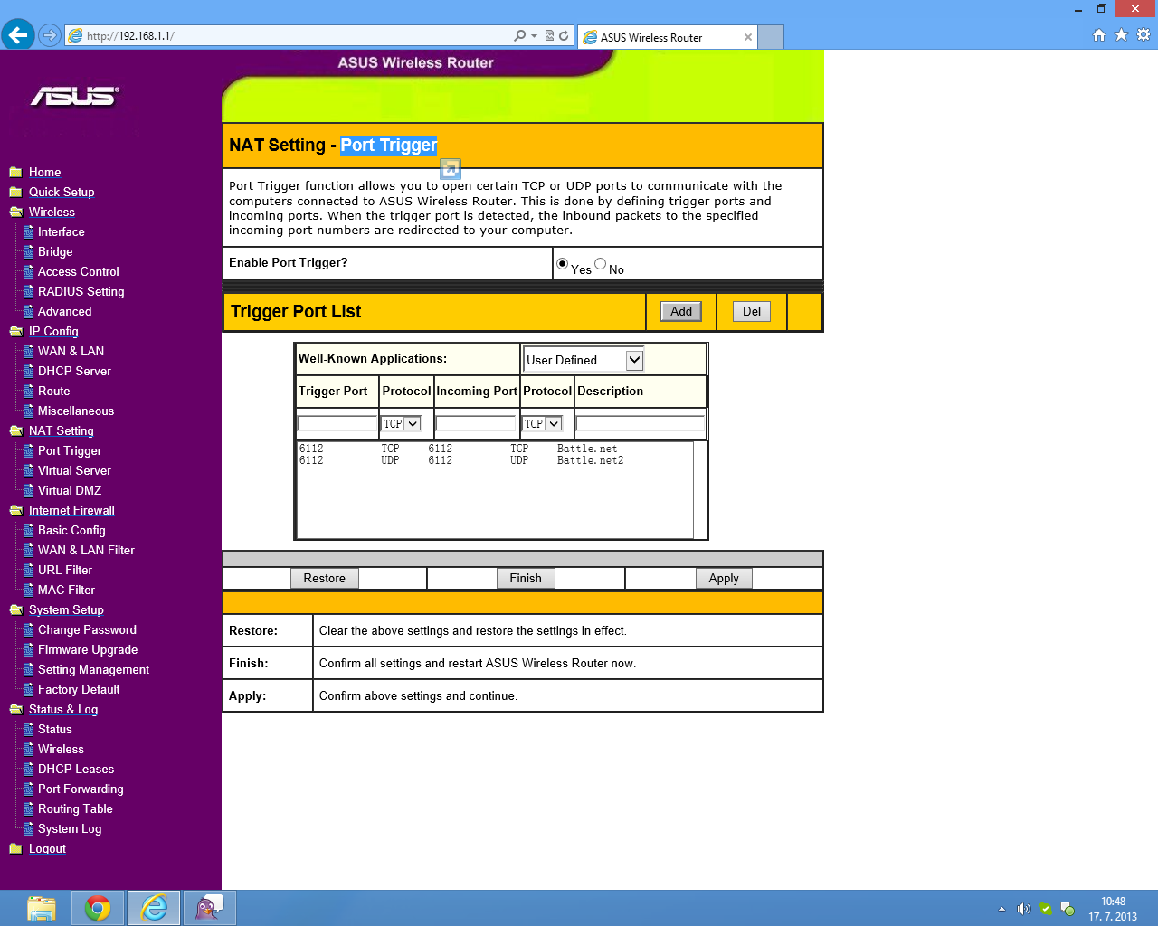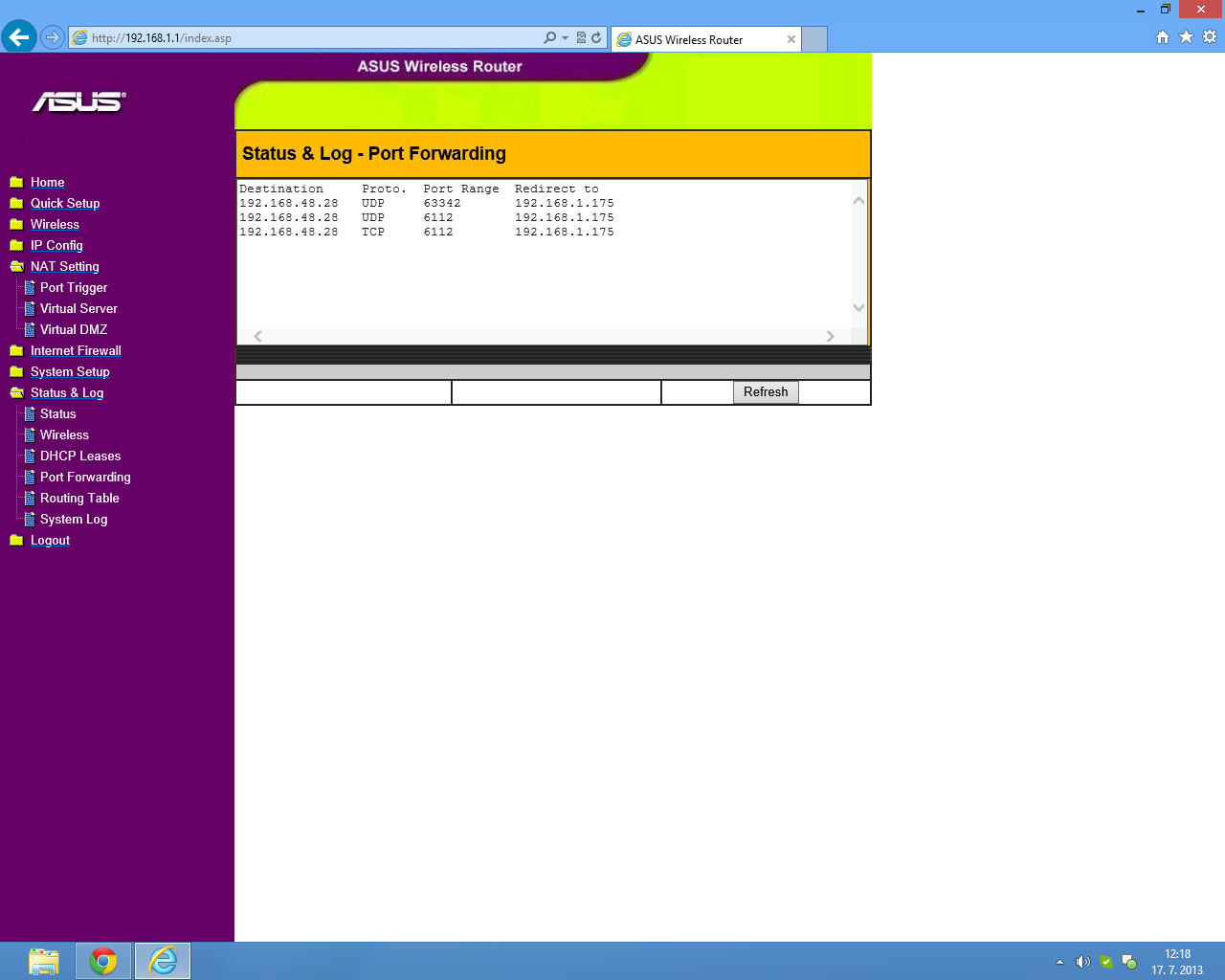 Pokoušel jsem se něco nastavit v sekci NAT Setting/Port Trigger (viz. obrázek 1) Dočetl jsem se, že se anglicky tento "problém" nejspíš jmenuje Port Forwarding (pokud jsem googlil správně). I tento link mám v nastavení routeru, ale je to zřejmě jen jakýsi přehled, nelze tam nic přímo nastavovat (viz. obrázek 2). Když jdu na adresu http://www.yougetsignal.com/tools/open-ports/ tak u portu 6112 mě to píše Port 6112 is closed.