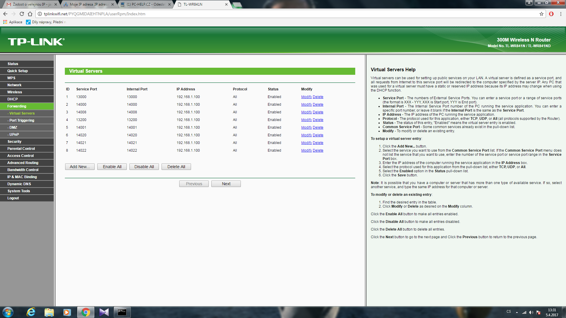 V routeru u port forwardingu nastav tvoji IP, co mas lokalne v siti, adresa z mojeip.cz je tvoje verejna, ale tu k tomu vubec nepotrebujes.