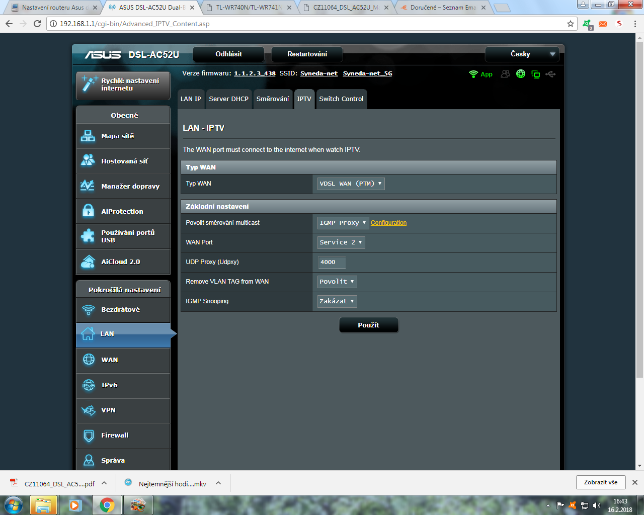 1. Podařilo se mi rozchodit pouze jednu TV, vůbec nevím jak mám nastavit druhý port lan do režimu tv. V manuálu, na stránkách výrobce i všude jinde na internetu je v záložce LAN-IPTV úplně jiná nabídka než mám já. Myslím že to bude nějaká aktualizace nebo tak něco.