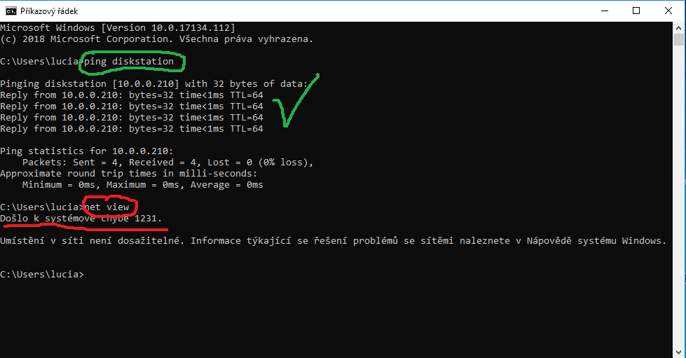 1. problém: Na název NASu ping funguje ale Net view hlásí chybu - viz obr. 1 (Někdy je ta chyba net view č. 64 "Zadaný síťový název není již dále k dispozici".) - viz Obr. 1