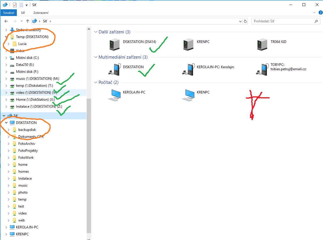3. problém: Pokud přidám umístění v síti (na nějakou složku NASu), pak se proklikám až na root NASu, vidím všechny složku NASu a NAS je vidět ve stromu sítě v průzkumníku. Není však pořád vidět jako samostatný počítač a ani při otevření sítě v jakémkoli programu není NAS vidět a není přístupný. - viz obr. 2 - (oranžově označeno).