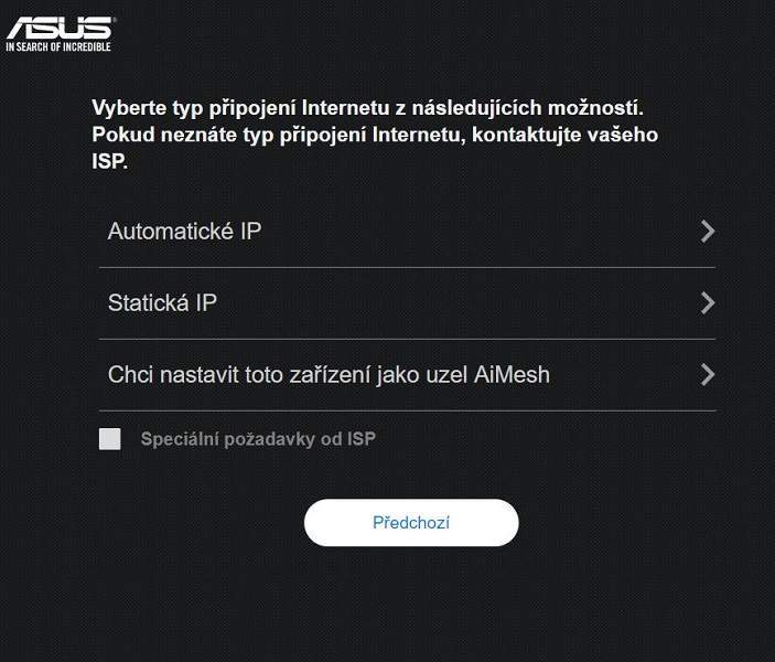 V dalším kroku uživatele čeká na výběr typu připojení k internetu, nebo zda má být router nastaven jako uzel AiMesh konfigurace.