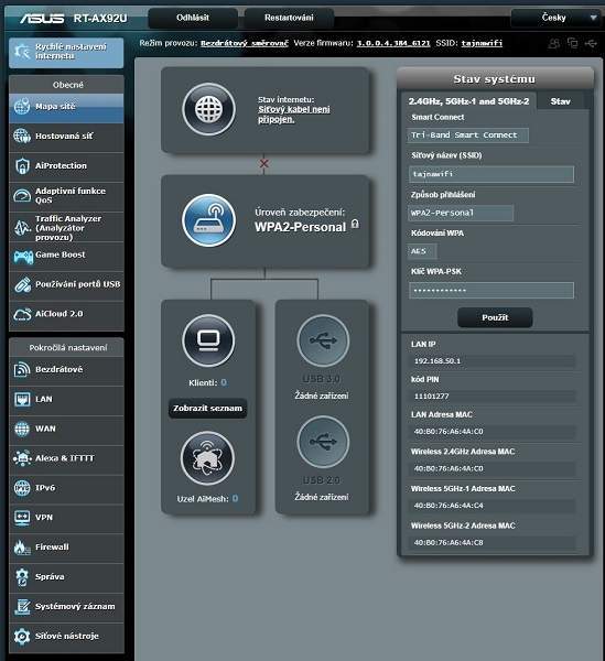 Po opětovném přihlášení k routeru se již zobrazí úvodní strana mapy sítě s podrobnějším nastavením routeru. V těle stránky se nachází informace o stavu připojení, konektivitě routeru, základními informacemi o bezdrátovém wifi připojení a stavu zobrazujícím využití procesoru a paměti RAM.