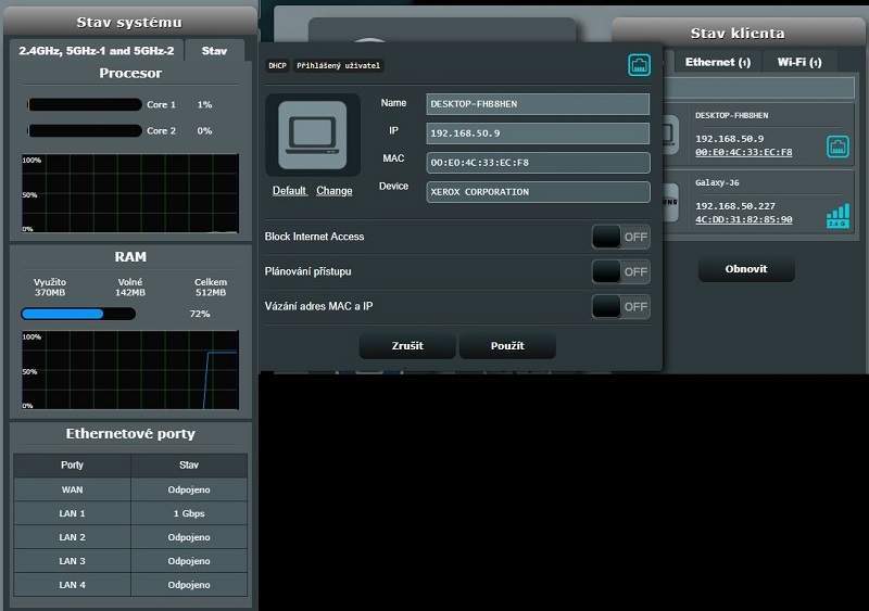 Po rozkliknutí klientů máme kompletní soupis aktuálně připojených zařízení. U každého připojeného zařízení lze dále nastavit vlastní jméno, ikonu, svázání MAC a IP adresy či blokování a nastavení plánování přístupu k internetu.