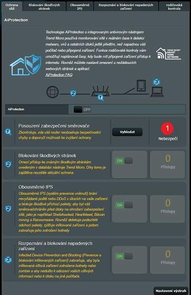 Velmi pozitivně bych hodnotil implementované funkce služby AiProtection, která má za úkol zároveň s běžným firewallem ochránit vaše zařízení před škodlivými weby, vnějšími útoky či nakaženými zařízeními umístěnými přímo v síti.
