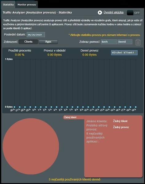Traffic analyzer – sekce zobrazující pokročilejší monitorování provozu sítě v několika různých grafech. Monitor provozu dokáže monitorovat využití bezdrátových sítí či drátové sítě v reálném čase, za posledních 24 hodin, či denní souhrn objemu přijatých a odeslaných dat.
