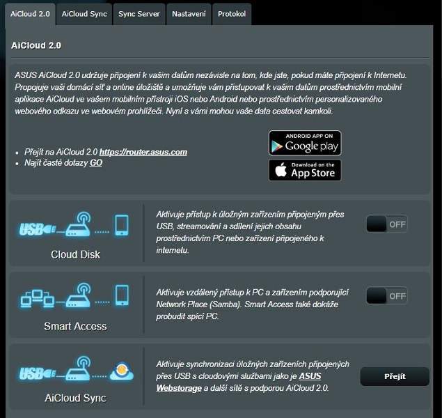AiCloud 2.0 – obsahuje nastavení online přístupu k zařízením / datům zařízení interní sítě prostřednictvím internetu mimo domácí síť.