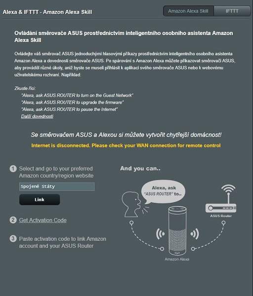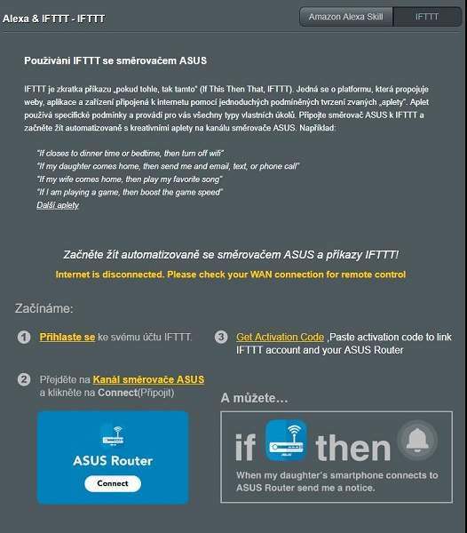Za zmínku stojí i podmenu Alexa & IFTTT. Router má možnost spárovat se s hlasovým asistentem Amazon Alexa určeným pro chytré domácnosti. Uživatel má pak široké možnosti ovládání routeru pomocí hlasu, například večer před spaním můžeme vyslovením jedné věty vypnout bezdrátové wifi sítě a mnohé další.