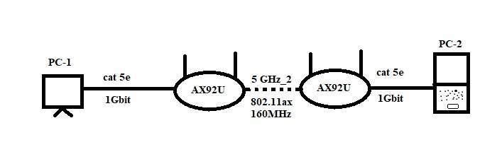 Nabízí se tedy druhá možnost, vyzkoušet propustnost tohoto wifi standardu při komunikaci mezi oběma routery AX92U v Mesh konfiguraci, které využívají jako komunikační linku (backhaul) právě tuto síť s ax standardem. Nakonfiguroval jsem tedy oba routery AX92U jako Mesh systém s tím, že využívají pro vzájemnou komunikaci druhou 5 GHz síť s povoleným standardem ax, rozšířenou šířkou kanálu na 160 MHz a manuálně nastaveným kanálem 100.