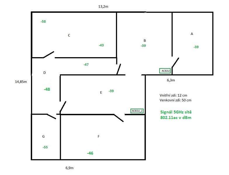 Dosah signálu bezdrátové sítě s pásmem 2,4 GHz byl téměř ve všech koutech domu plný, rozhodl jsem se proto změřit pouze dosah signálu 5 GHz bezdrátové sítě se standardem 802.11ac.