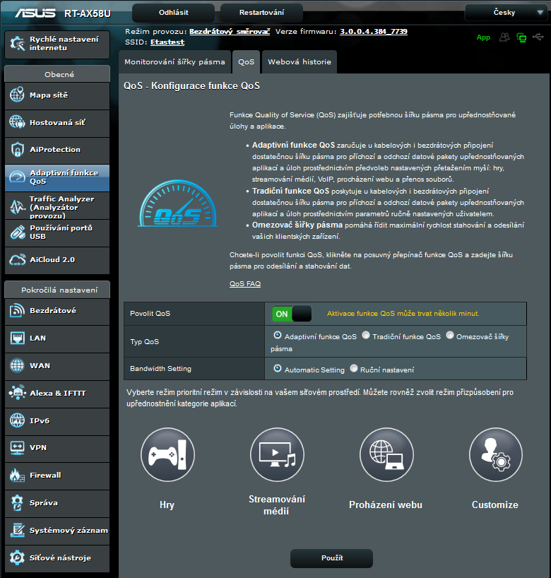 Adaptivní funkce QoS - Quality of Service - v podstatě přednostní doručování paketů pro služby, které upřednostňujete. V případě adaptivního nastavení můžete volit mezi prioritou pro hry, media, web, nebo si potřebné nastavit sami. A pokud si přejete nastavit omezení rychlosti, jste zde správně. Mimo jiné je zde i možnost sledovat aktuální vytížení šíře pásma pomocí monitoringu.