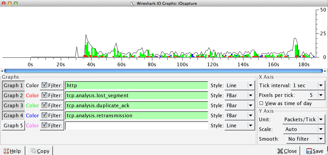 Jen tak mě napadlo, že bych se podíval na grafové znázornění provozu třeba na adrese it.src==192.168.0.100 že by mohlo být vidět, zda vypadavá wifi signál. Že by po přiblížení grafu třeba výpadky mohly být pěkně vidět. Vím, že to jde třeba přes PING, ale chtěl jsem to zkusit i přes WShark.