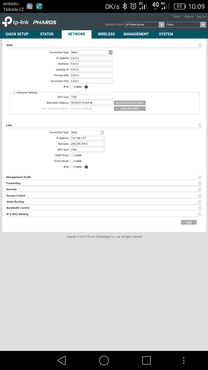 Dnes jsem se dostal k nastavení. Přepnul jsem CPE220 na AP Client Router (WISP Client). Mám to určitě špatně nastavené, protože wifi to vysílá, zařízení se k wifi připojí, ale internet není. Je to nastaveno takto: