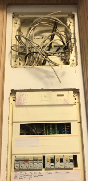 Všechny kabely jsou svedené do pojistkové skříně, kde koukají jen holé kabely bez koncovek a popisků - na zásuvkách také žádné označení není.
