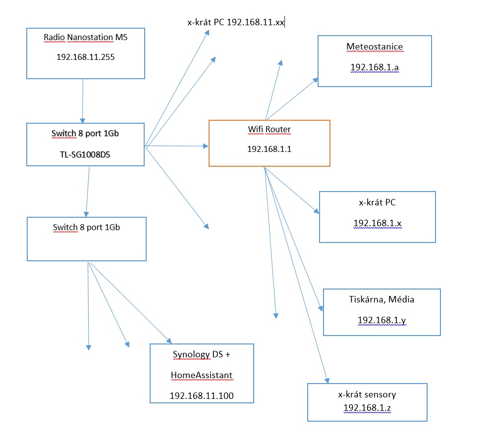 No mě to právě taky nedává smysl. Nicméně síť takto funguje až na ta omezení ohledně Home Assistenta, který nevidí ty wifi senzory. Myslím si, že Nanostation routuje a pak návazně routuje i asus. Možná bych to vyřešil přepnutím asusu do AP módu namísto wifi routeru a nechal všechno na Nanostation, ale nevím co to udělá a nechci zkoušet každou slepou uličku. Navíc k Nanostation má přístup jen provider a případné následné problémy bych musel řešit s ním. Každá rada asi drahá, ale díky za ní.