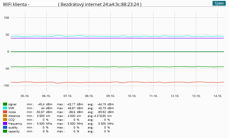 linka je v pořádku, přikládám graf provozu za poslední týden. Vyzkoušejte restart zařízení = odpojení zdrojů napájení od elektřiny na dobu alespoň 1 minuty. Je třeba odpojit napájení antény, routeru, popř. jiných prvků ve vnitřní síti.