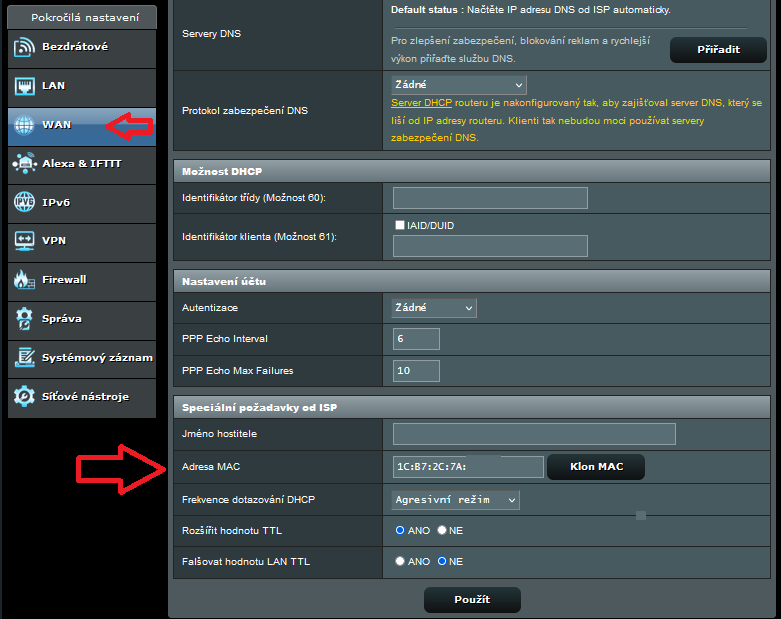 Díval jsem se do nastavení routeru, který je napojený na anténu, ale MAC adresa tam není.