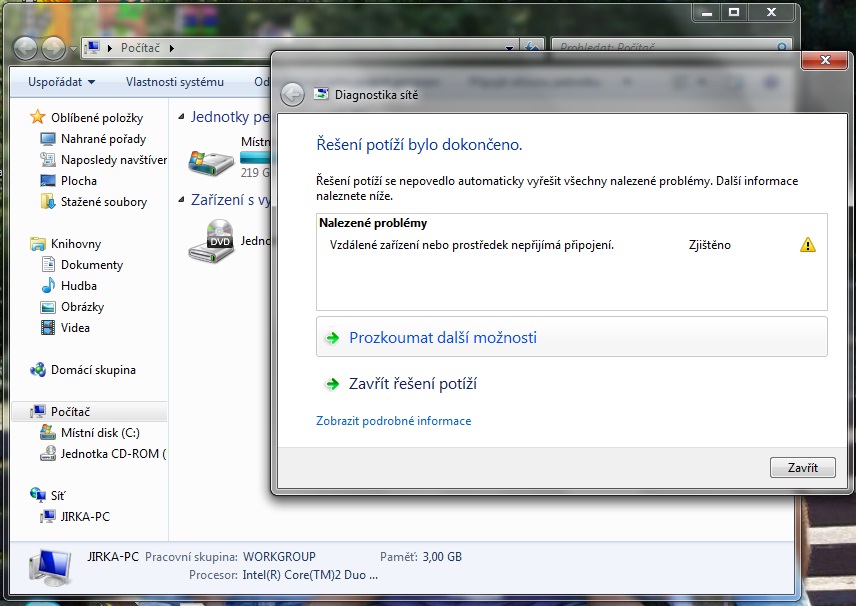 Tak firewallem to taky není, napsalo to stejnou hlášku jako předtím. Zkusil jsem pak diagnostiku a ta napsala toto :