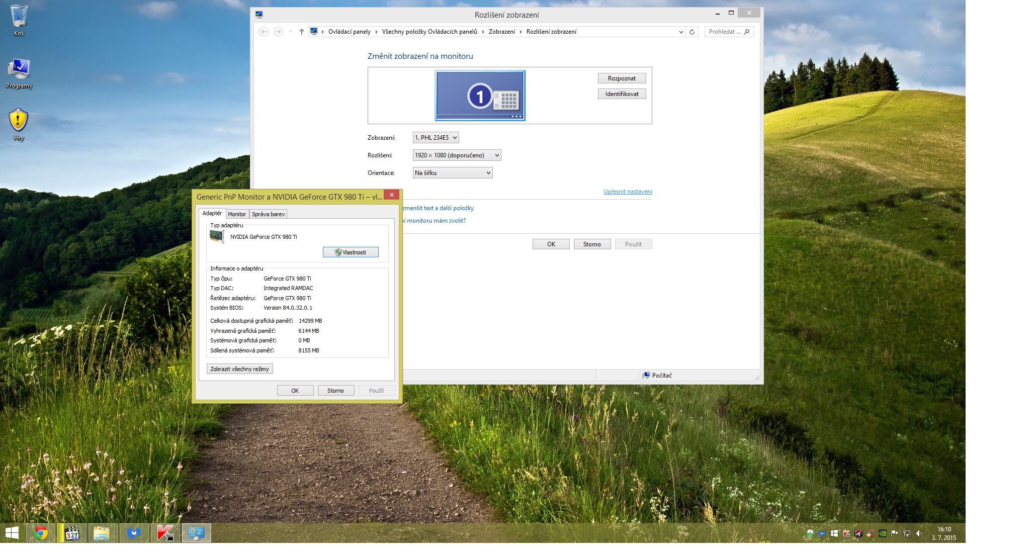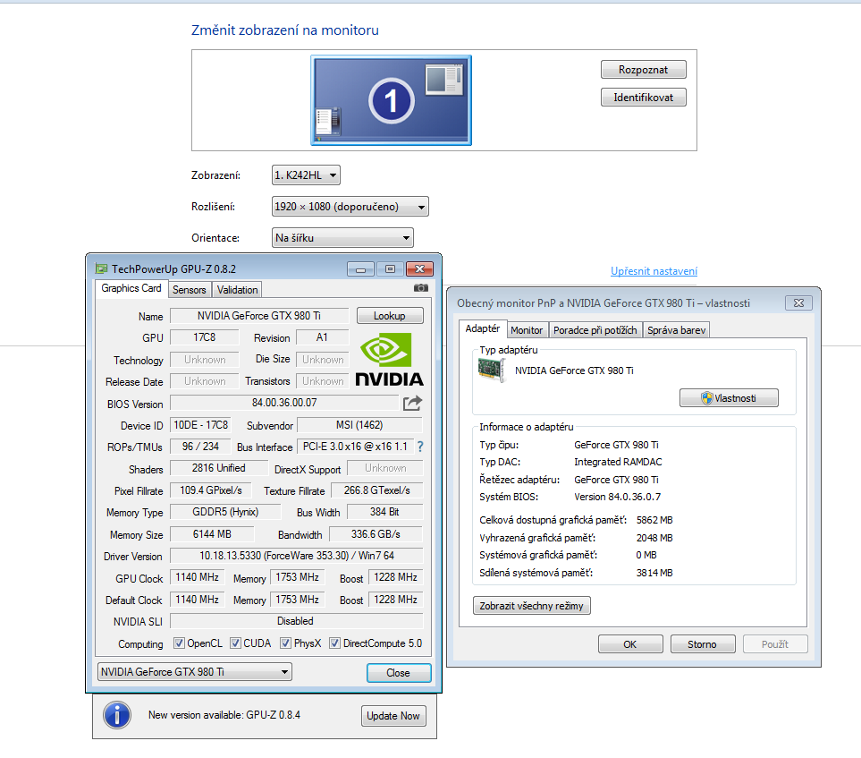 Čau koupil jsem si GTX 980TI GAMING 6G ale když dám rozlišení obrazovky - upřesnit nastavení ve Windows tak to ukazuje že vyhrazená grafická paměť je jenom 2048MB když ale otevřu GPU-Z tak to ukazuje normálně 6144MB. Hraji na 1080P a mám Windows 7 Ultimate 64bit čistá instalace nainstaloval jsem jenom ovladače.