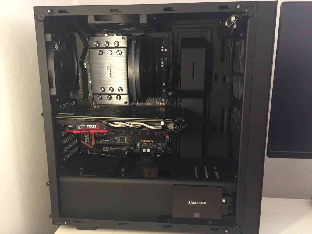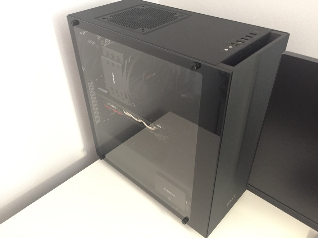 Není tam toho moc vidět, za což jsem rád. Case je hodně minimalistická, ale jsou v ní schované i 3 velké HDD. Z komponent obsahuje I5 6500, desku AS Rock Z170 Extreme 4, grafiku MSI GTX 1060 3 GB. CPU cooler je Be Quiet Extreme 3, SSD Samsung EVO 250 GB, zdroj Corsair RM 650x. Mám ještě v plánu dodat větráky na přední stranu a možná nahradit origo NZXT, přecejen nejsou úplně top.
