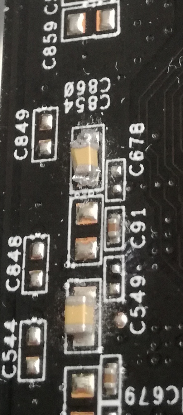 Před rokem se mi stala taková příhoda, že při čištění pc (otevřeno po půl roce) vyndám GK, položím ji na stůl.. a slyším jak něco odpadlo.. byl to miniaturní.. něco.. na desce označeno jako C854.. podařilo se mi ho znova připájet a karta běžela až do teď bez sebemenšího problémů..jen to vypadá prostě trošku jinak.. viz Má smysl se pokoušet to trošku pájkou eště zkrášlit?