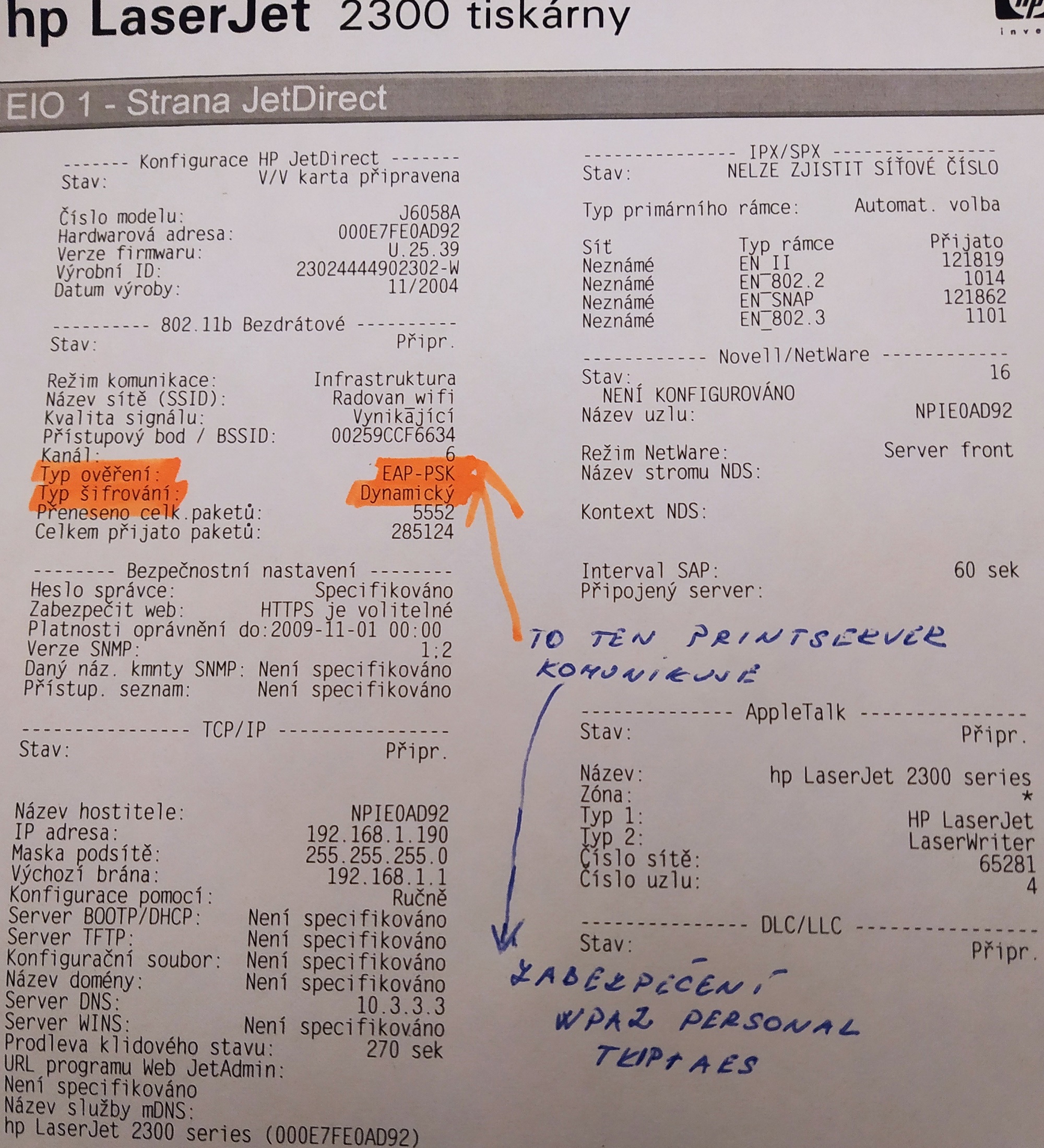 Tak jenom pro zajímavost se mě ten printserver podařilo zprovoznit i pod šifrováním WPA2 -personal - TKIP+AES