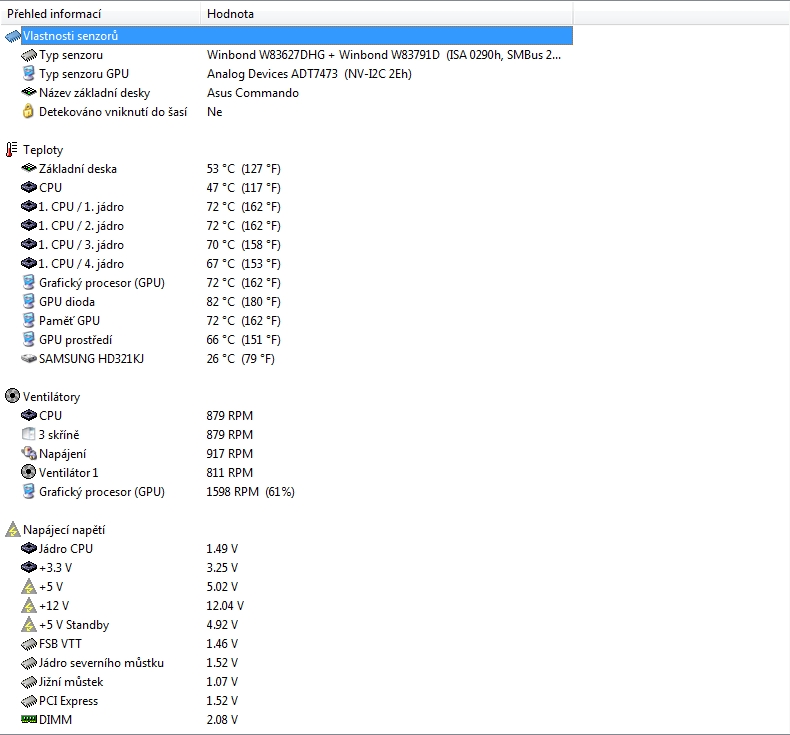 Nj.disk je přímo ledový.Ten ti vydrží dlouho.Procesor má vyšší teplotu,ale je vcelku dost přetaktovaný.Osobně bych takt snížil raději na něco kolem 3,0Ghz.Stejně jeho výkon ani nevyužiješ a pak zbytečně topí.Grafiku už jsem zvyklý na něco kolem 60°C,tak se mi zdá taky vyšší teplota dost.No ale mám lepší chladič (Accelero S1),tak je to taky O.K.
