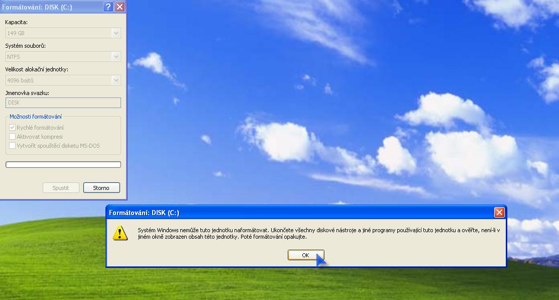 Marfy píše:Pokud máš instalační CD Windows,tak z něho nabootuj a zformátuj ten disk přímo z CD.