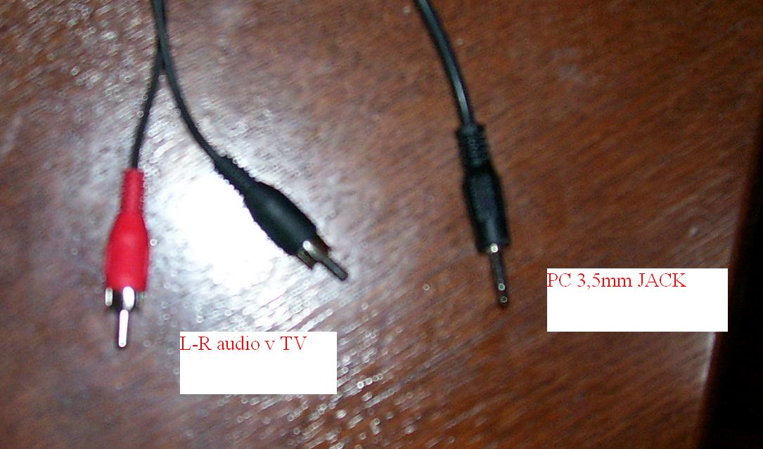 Proto jsem si koupil kabel (viz obr.) který mám v PC zapojenej jako repro nebo sluchátka v zeleným konektoru (jack 3,5mm) a do televize sem ho zapojil do dvou audio vstupů pro pravý a levý konektor.