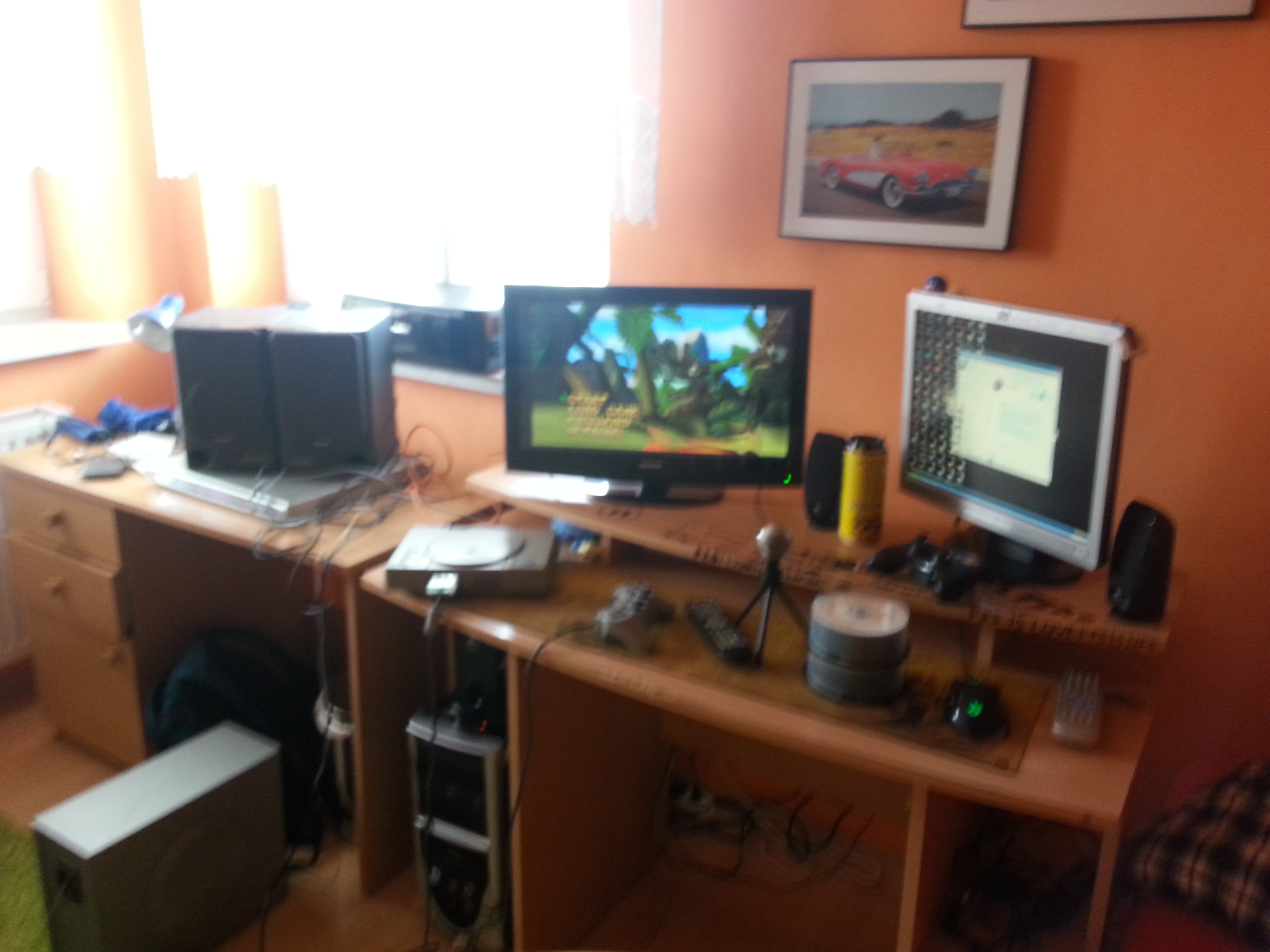 Já jsem si udělal radost televizí Sencor do pokoje. Strejda ji vyhrál na plese, a jelikož má UHD prohnutou televizi, tak mi ji dal. Chtěl jsem si na ní zahrát PS1 hry, jenže televize má jen SCART a nemá cinche, tak mě to dožralo. Tak jsem dotáhl starý domácí kino a propojil PS1 cinchema s kinem a kino SCARTem s televizí. Kino příjmalo zvuk, ale ne obraz. Zjistil jsem, že ta PS1 má jakýsi výstup. Vypadá to jako VGA. Tak jsem vzal scart kabel a trojbarevný káblík a udělal hybrida. Žlutý konektor nahradil SCART a zbytek jsem nechal. Takže jsem zapojil SCART do televize, cinche do kina a poslední konektor do PS1. A funguje to. Zpestřil jsem si to energy drinkem Monster Energy The Doctor.