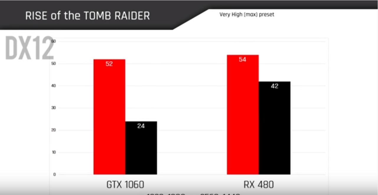 S novými ovladači má RX 480 vyšší výkon než GTX 1060 v ROTTR. Obě karty jsou přetaktované na max bez zvyšování napětí