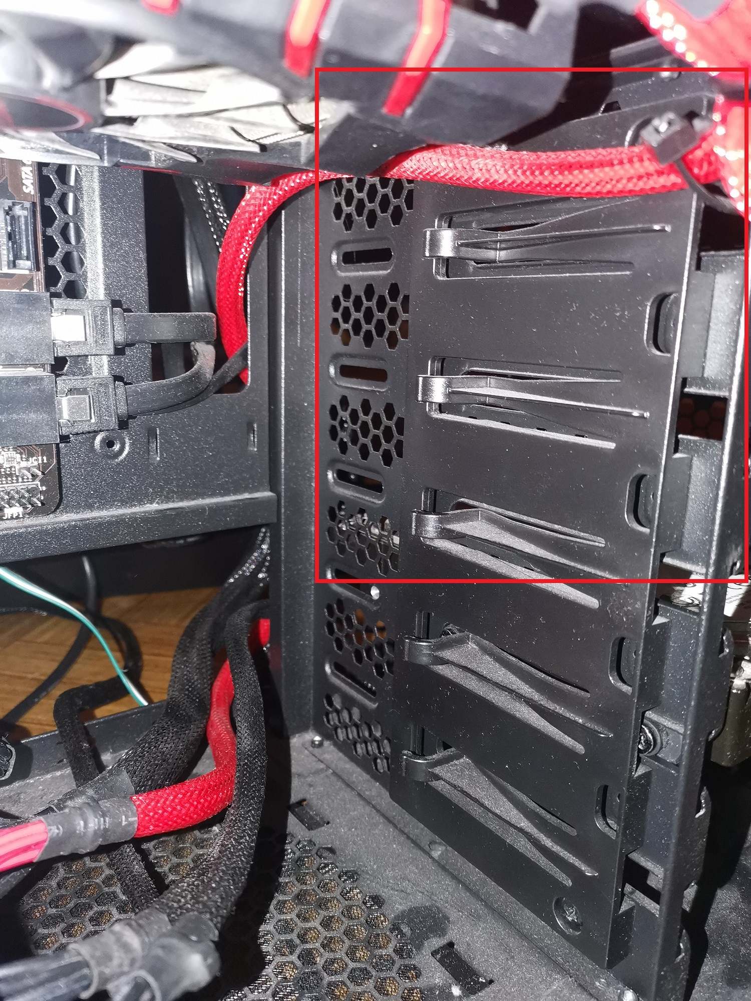 Tomu přednímu ventilátoru ale fakticky ty ,,šuplíky" na disky hodně překáží, co kdybych vzala štípačky a prostě to vyštípala? Mně to vadit nebude, bednu prodávat nebudu a do případné nové sestavy ji určitě přenášet nebudu. (Potencionální štípaní - červená barva)